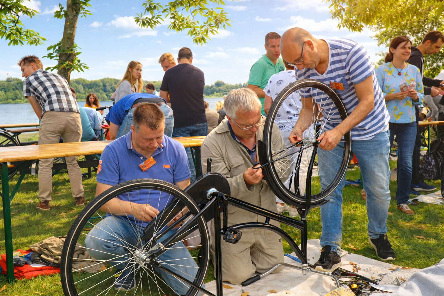 Bouw een fiets voor Afrika organiseren wij op elke gewenste locatie. Jullie hoeven nergens aan te denken, wij nemen alles mee: fietsonderdelen, gereedschap, werkmatten en accessoires. Op jullie locatie toveren onze begeleiders de ruimte om tot een creatieve werkplaats. Zij zorgen voor een heldere uitleg, de juiste energie en een vlot programmaverloop. En na afloop ruimen wij alles netjes op. Jullie team houdt alleen de energie, de herinneringen en het goede gevoel over. Teambuilding zonder zorgen, met een impact die ver voorbij de dag reikt.