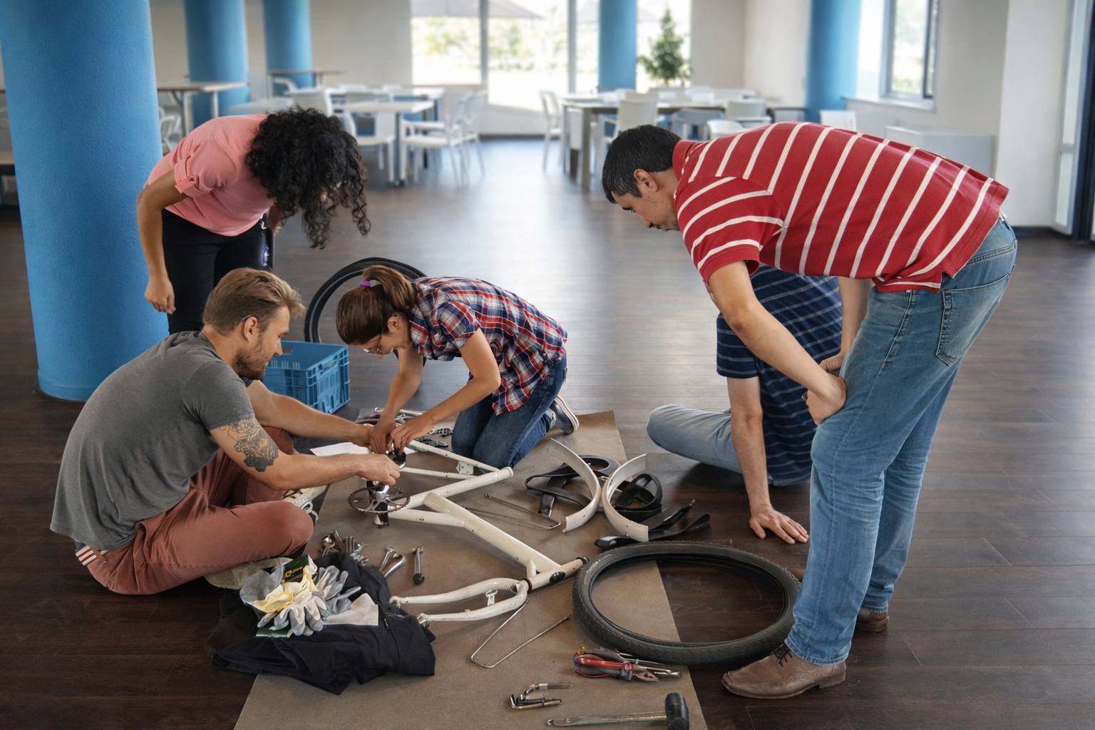 Of dat nu een industriële ruimte in Leidsche Rijn is, een landgoed in het groen of jullie eigen bedrijfsterrein. Fietsonderdelen, gereedschap, werkmatten en accessoires, alles wordt door ons geregeld en opgebouwd. Onze begeleiders zorgen ter plekke voor een energieke sfeer, een duidelijke uitleg en een programma dat vlot verloopt. Is het klaar? Dan pakken wij alles weer in en laten wij de ruimte netjes achter. Jullie houden alleen de herinneringen, de energie en het goede gevoel over.